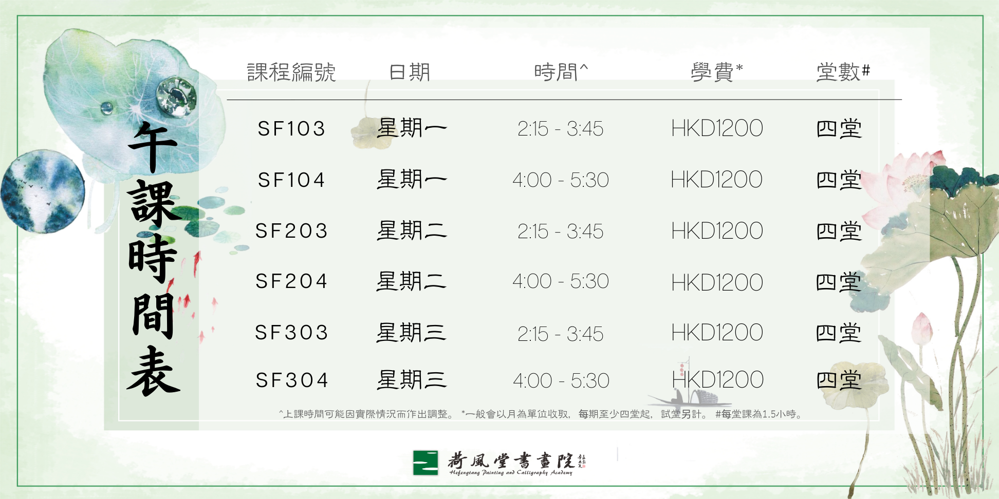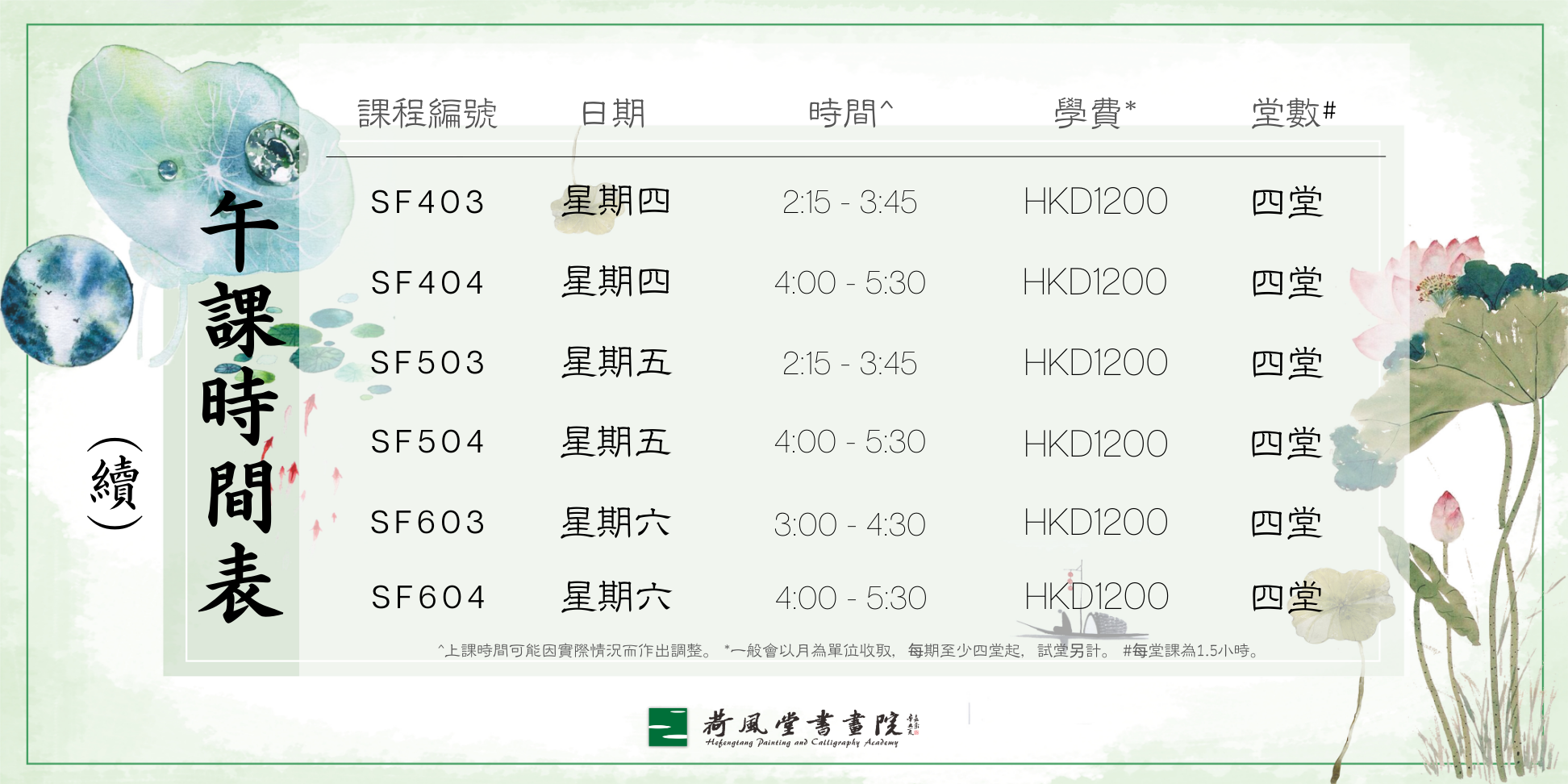 ■ 因颱風或其他惡劣天氣而取消之課堂,本書畫院將會安排補課,唯恕不安排退款。